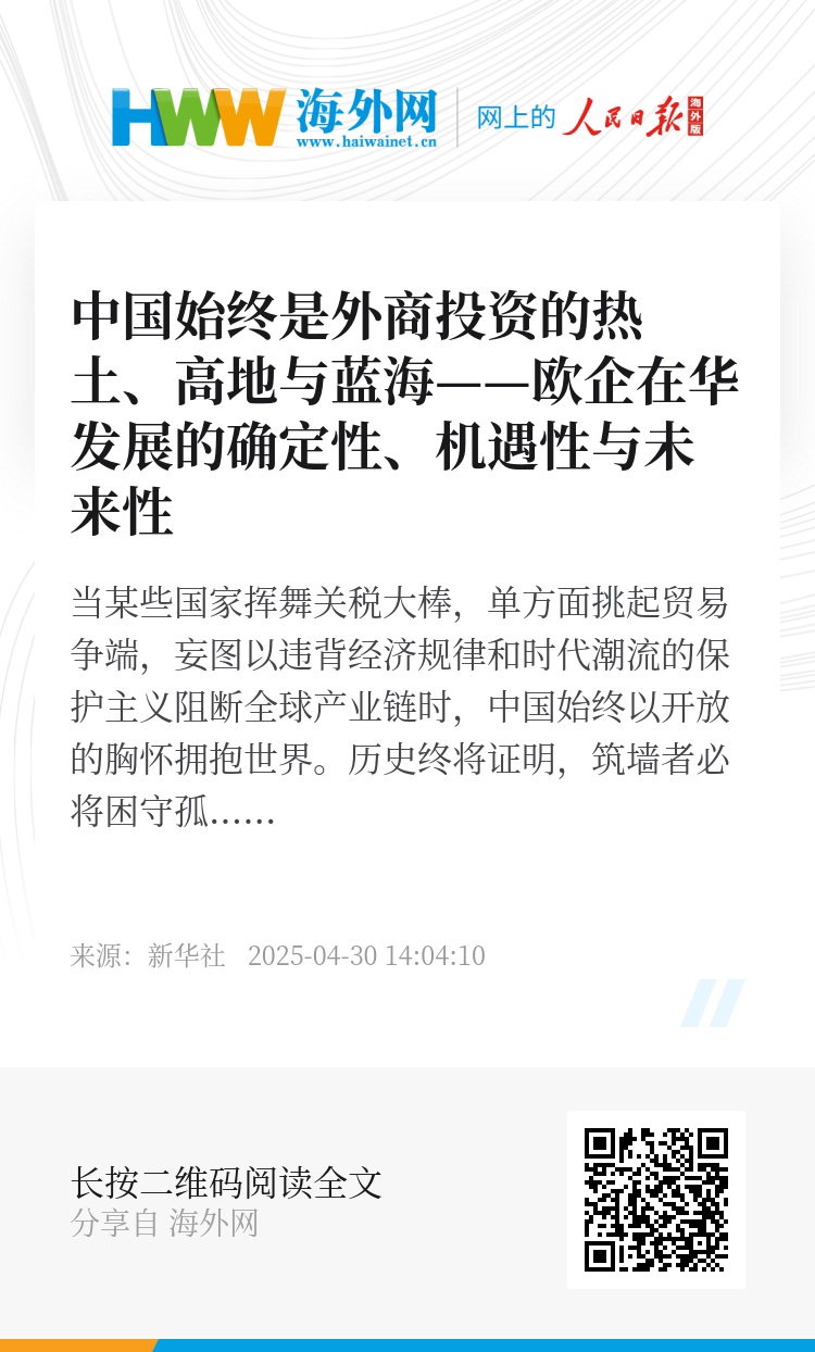 欧企在中国的发展,短期看是应对挑战的避风港,中期看是转型升级的助推器,长期看是基业长青的压舱石。《中国德国商会:2024 - 2025年度商业信心调查报告》显示,在华德国企业将迎来本地化3.0阶段,深度融入中国商业生态系统,企业不仅服务中国市场,还立足中国面向全球。当某些国家热衷于筑墙设垒时,中国始终在修筑通往未来的桥梁。这些“用脚投票”的选择,无不昭示:拥抱中国市场的企业,终将被时代所拥抱。