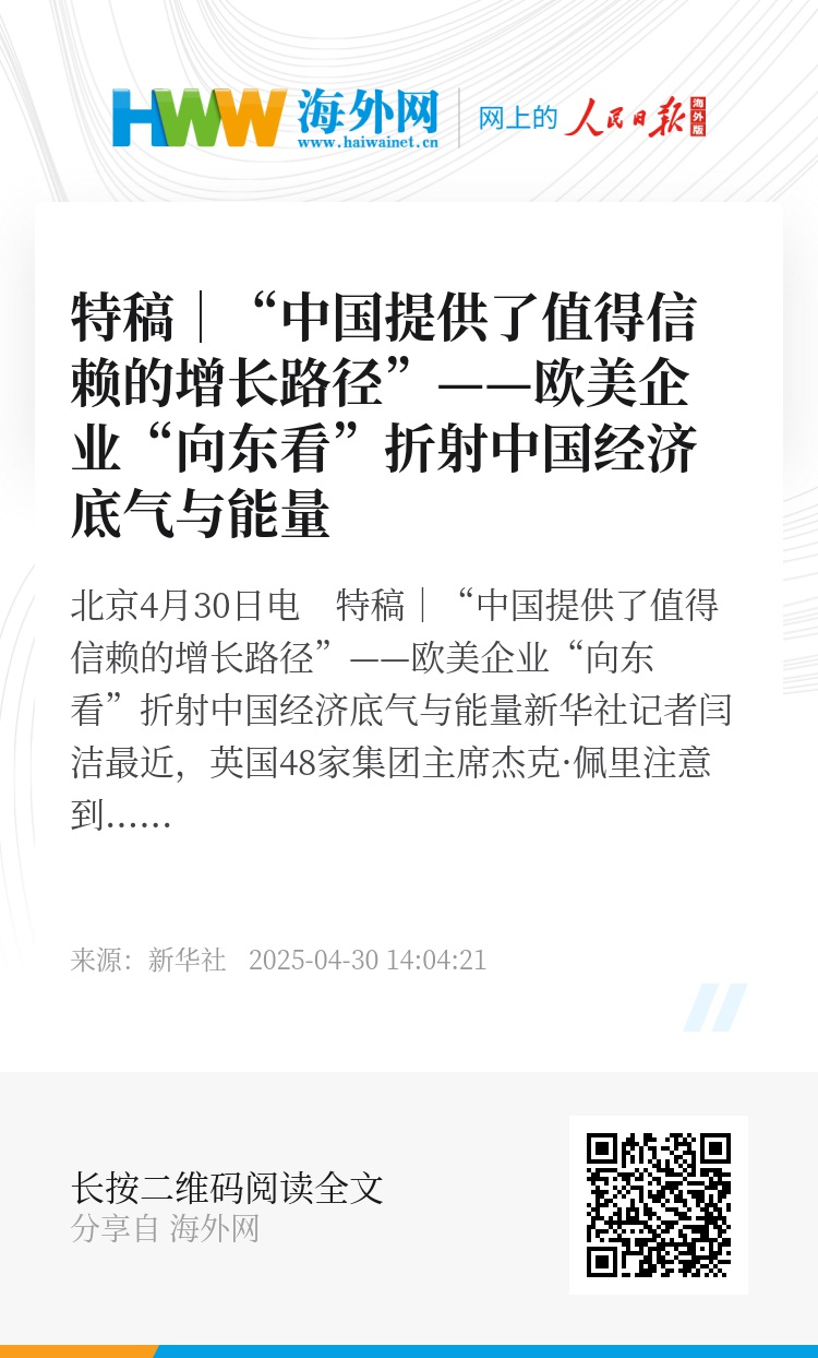 新华社北京4月30日电 特稿|“中国提供了值得信赖的增长路径”——欧美企业“向东看”折射中国经济底气与能量