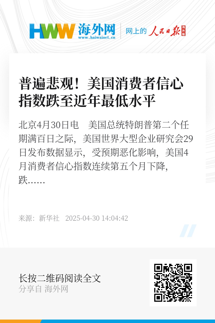 新华社北京4月30日电 美国总统特朗普第二个任期满百日之际,美国世界大型企业研究会29日发布数据显示,受预期恶化影响,美国4月消费者信心指数连续第五个月下降,跌至新冠疫情以来的最低水平。