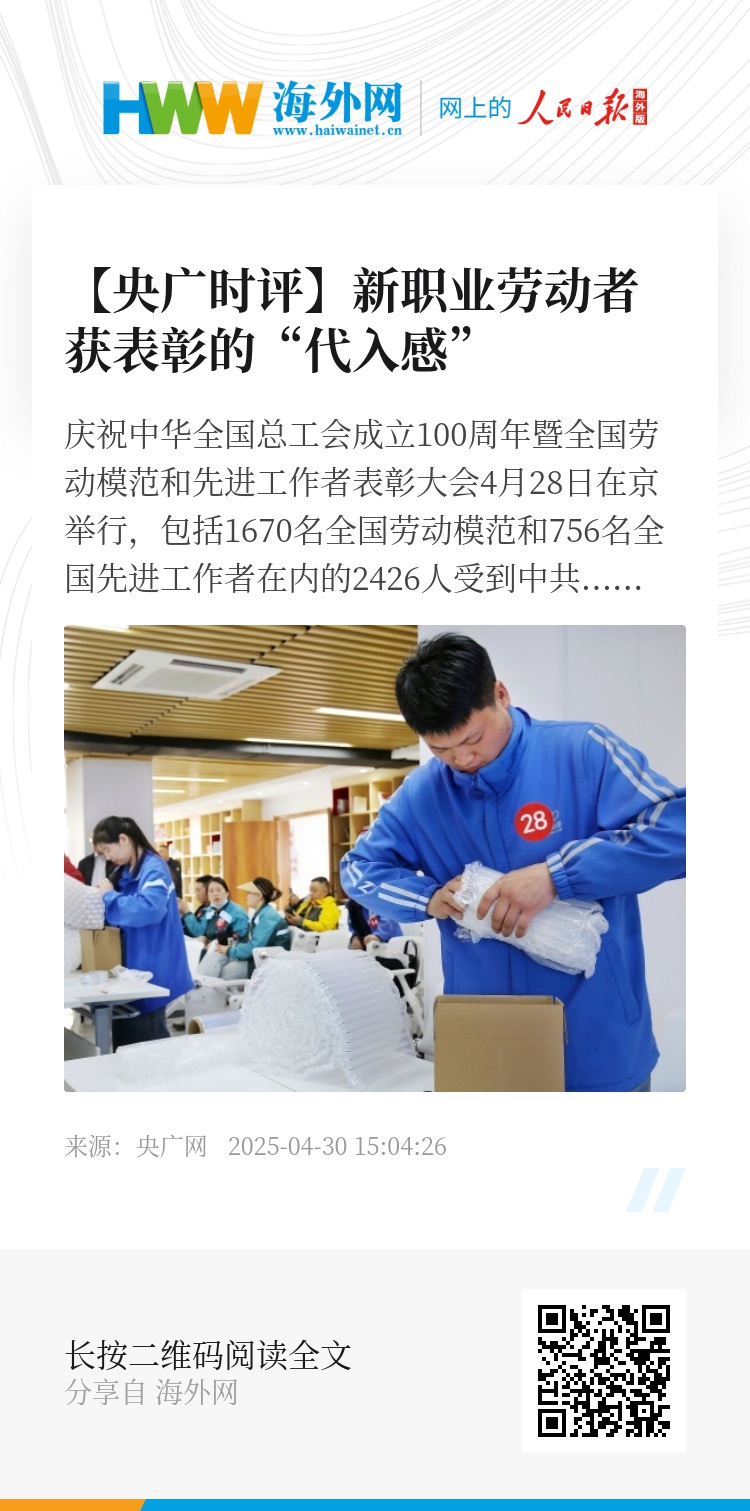 这是我国第17次评选表彰全国劳动模范和先进工作者。获表彰的人员中,既有来自传统农、林、牧、渔业、制造业等行业劳动者,也有教科文卫一线工作者,还有羌绣技艺指导师等中华优秀传统文化的传承者,而外卖骑手、快递接驳员、家政服务培训师等新职业劳动者也获此殊荣,得到党和政府的表彰,让我们全社会每个人都有强烈的“代入感”。