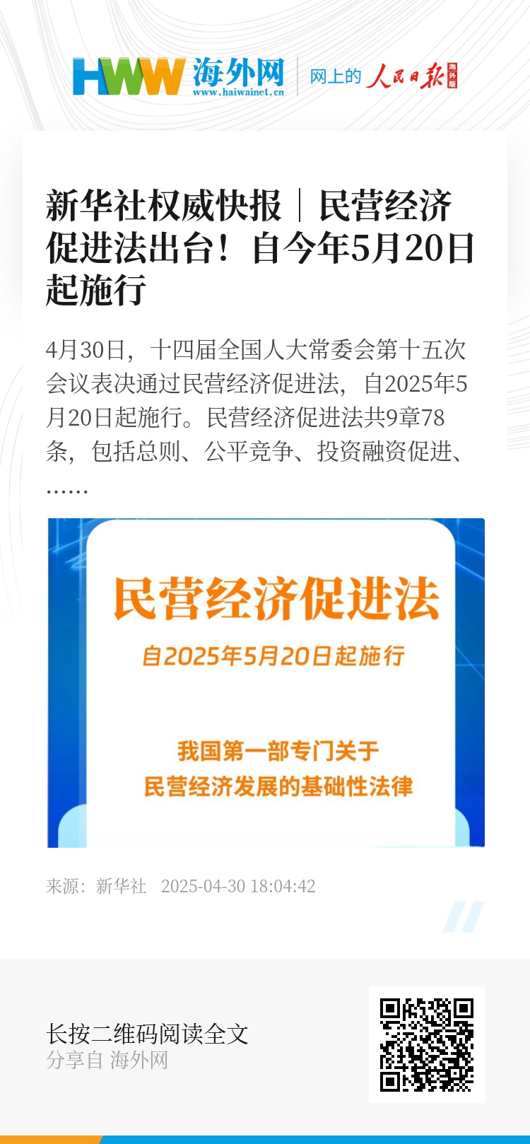 4月30日,十四届全国人大常委会第十五次会议表决通过民营经济促进法,自2025年5月20日起施行。民营经济促进法共9章78条,包括总则、公平竞争、投资融资促进、科技创新、规范经营、服务保障、权益保护、法律责任和附则。