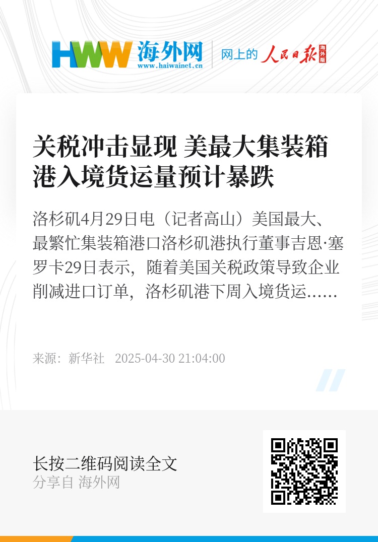 塞罗卡当天接受美国消费者新闻与商业频道节目采访时说,来自中国的货物约占洛杉矶港业务的45%,受关税政策影响,美国部分主要零售商已暂停所有中国商品的发货。