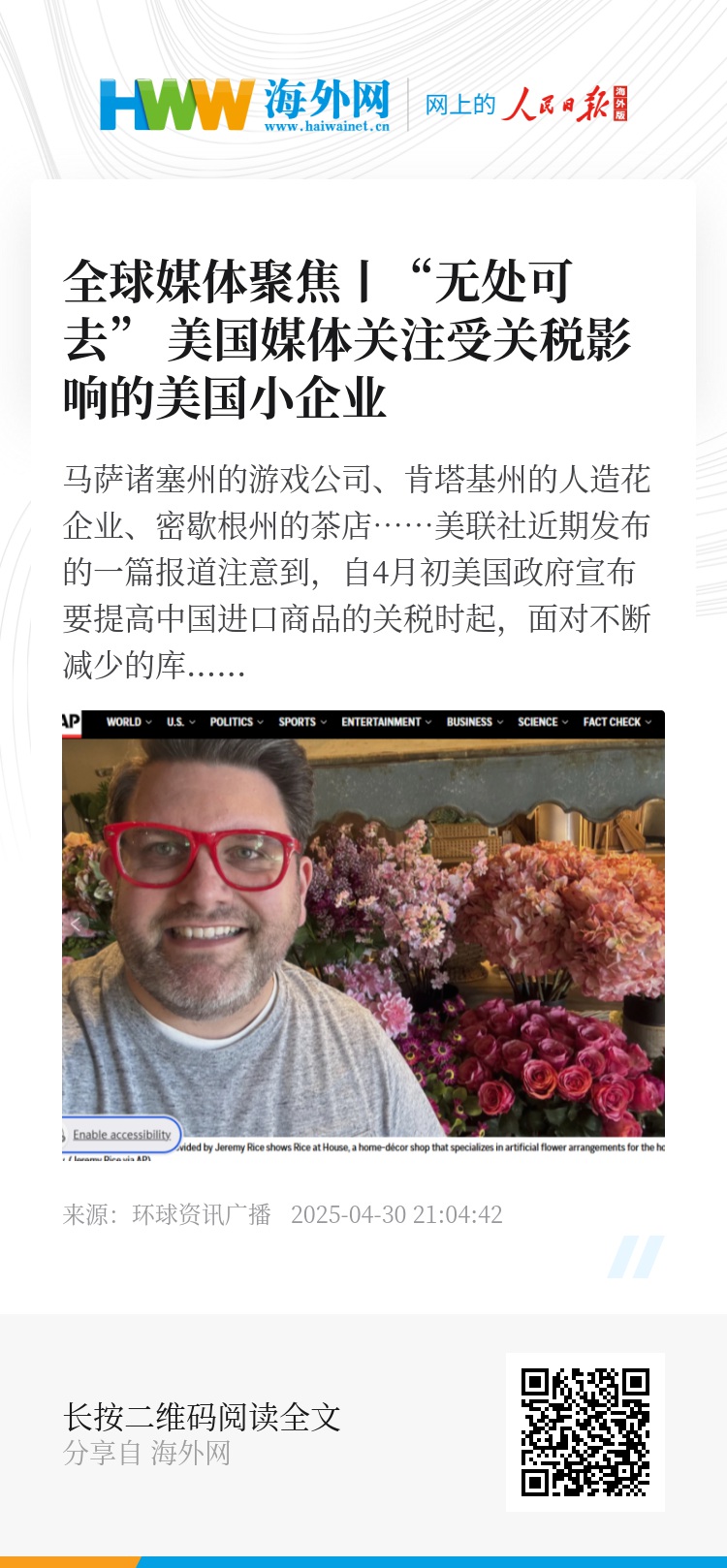 马萨诸塞州的游戏公司、肯塔基州的人造花企业、密歇根州的茶店……美联社近期发布的一篇报道注意到,自4月初美国政府宣布要提高中国进口商品的关税时起,面对不断减少的库存和飞涨的成本,许多依靠中国进口商品生存的美国小企业主正变得越来越绝望。
