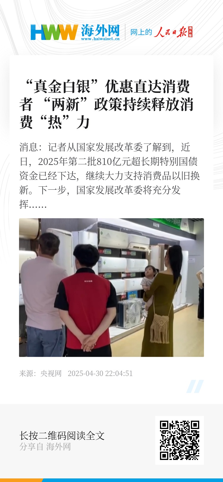 央视网消息:记者从国家发展改革委了解到,近日,2025年第二批810亿元超长期特别国债资金已经下达,继续大力支持消费品以旧换新。