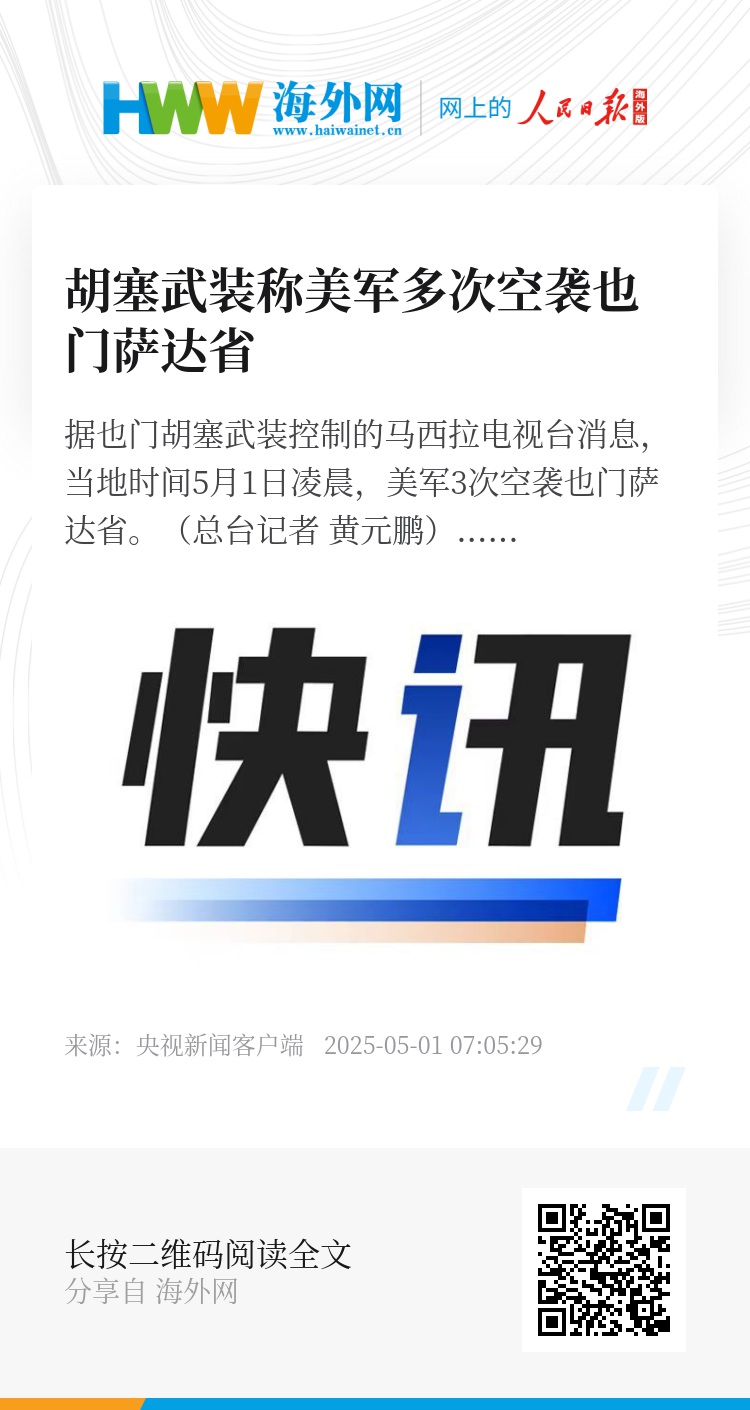 据也门胡塞武装控制的马西拉电视台消息,当地时间5月1日凌晨,美军3次空袭也门萨达省。(总台记者 黄元鹏)