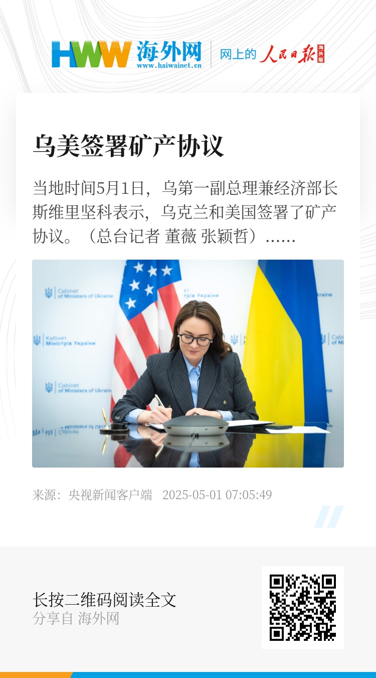 当地时间5月1日,乌第一副总理兼经济部长斯维里坚科表示,乌克兰和美国签署了矿产协议。(总台记者 董薇 张颖哲)