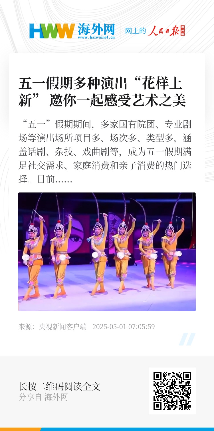 “五一”假期期间,多家国有院团、专业剧场等演出场所项目多、场次多、类型多,涵盖话剧、杂技、戏曲剧等,成为五一假期满足社交需求、家庭消费和亲子消费的热门选择。
