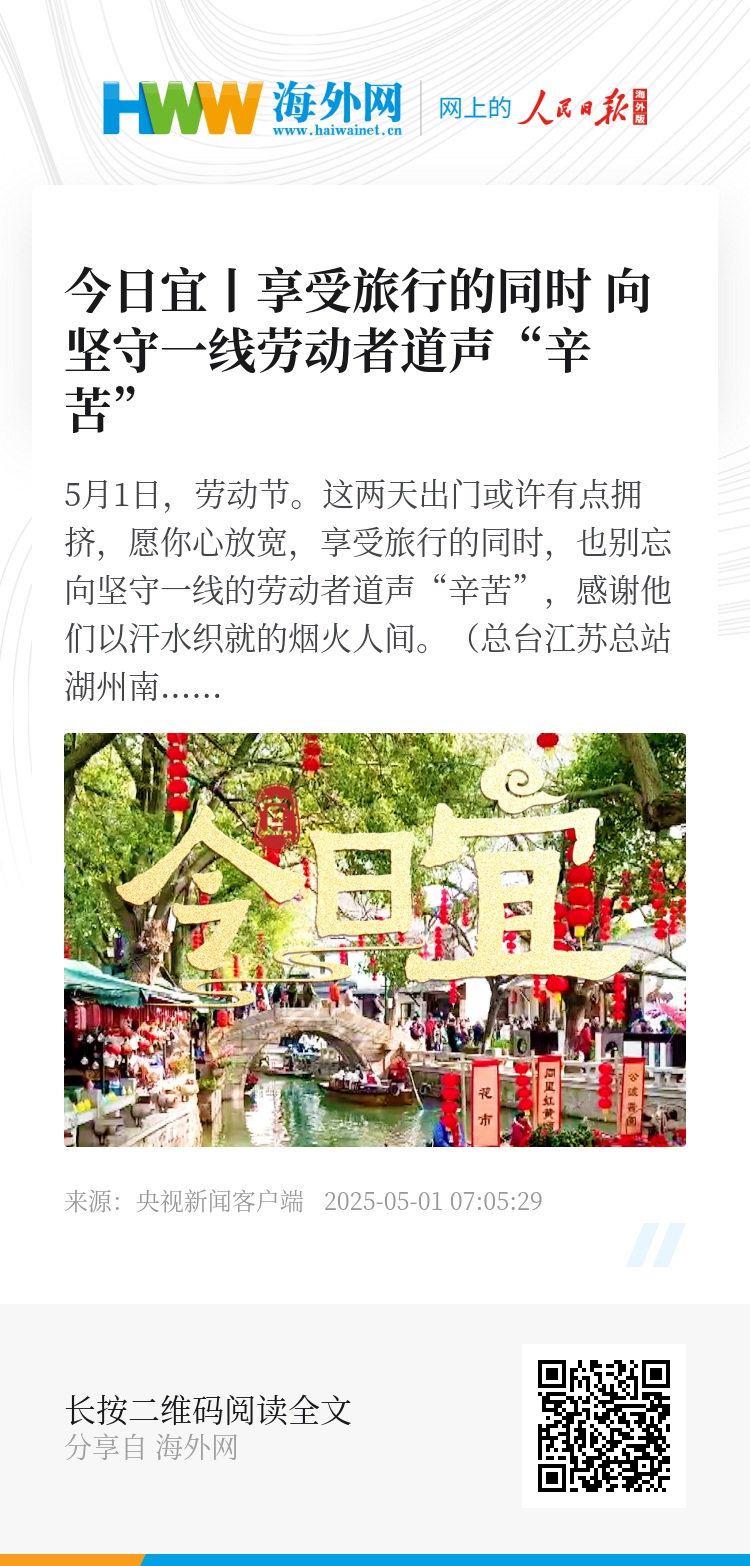 5月1日,劳动节。这两天出门或许有点拥挤,愿你心放宽,享受旅行的同时,也别忘向坚守一线的劳动者道声“辛苦”,感谢他们以汗水织就的烟火人间。