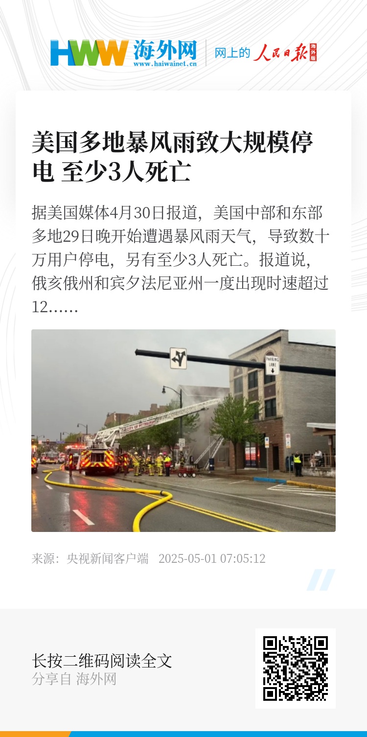 据美国媒体4月30日报道,美国中部和东部多地29日晚开始遭遇暴风雨天气,导致数十万用户停电,另有至少3人死亡。