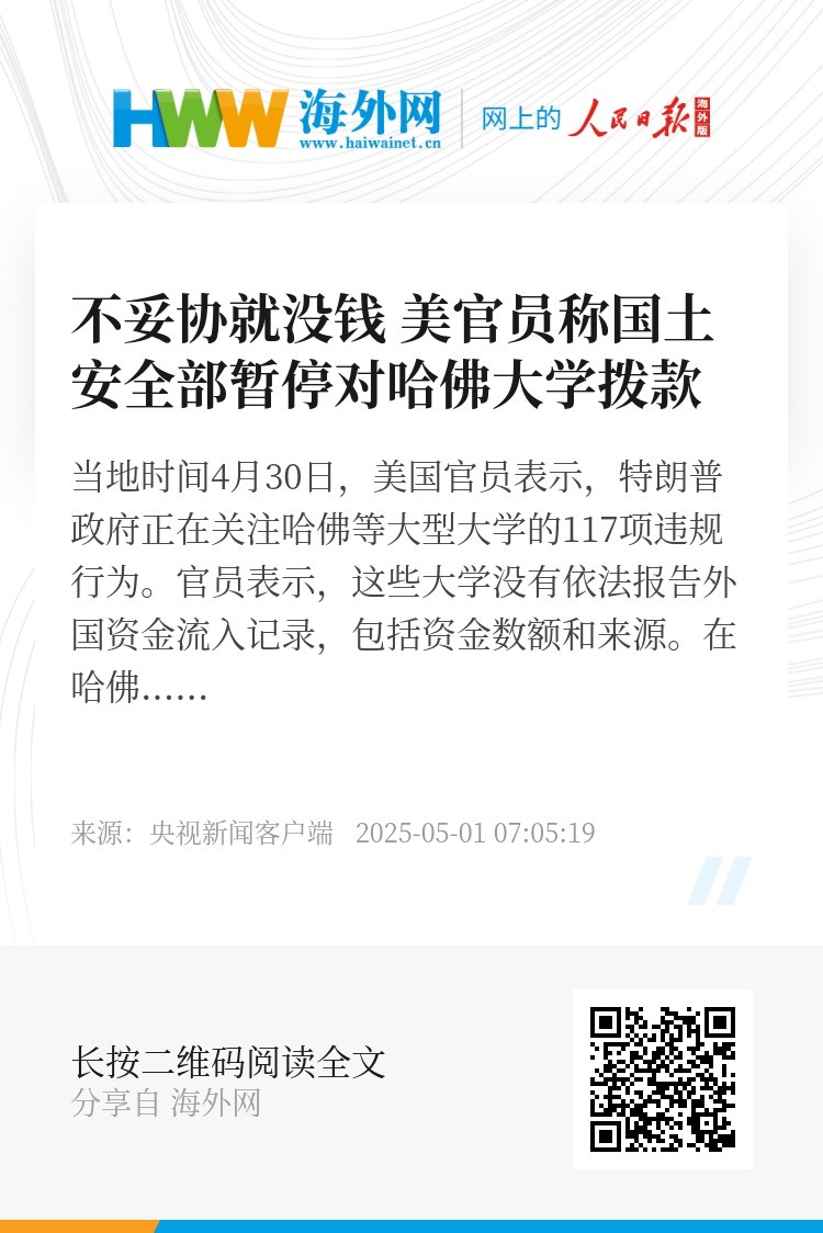 当地时间4月30日,美国官员表示,特朗普政府正在关注哈佛等大型大学的117项违规行为。官员表示,这些大学没有依法报告外国资金流入记录,包括资金数额和来源。在哈佛大学提供名单之前,他们不会再从国土安全部获得任何拨款。(央视记者 许骁)