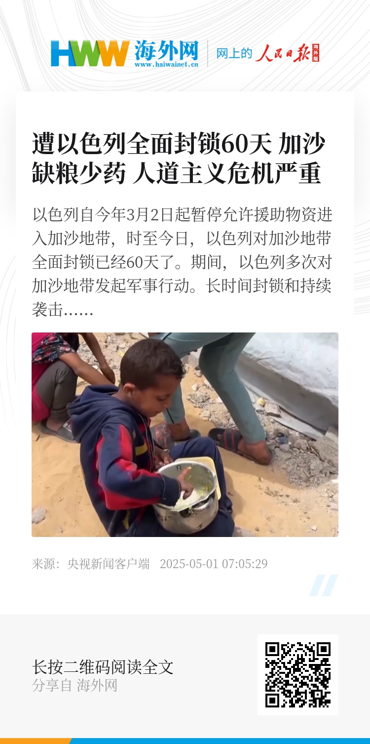以色列自今年3月2日起暂停允许援助物资进入加沙地带,时至今日,以色列对加沙地带全面封锁已经60天了。期间,以色列多次对加沙地带发起军事行动。长时间封锁和持续袭击导致加沙地带的食物和药品短缺愈发严重。
