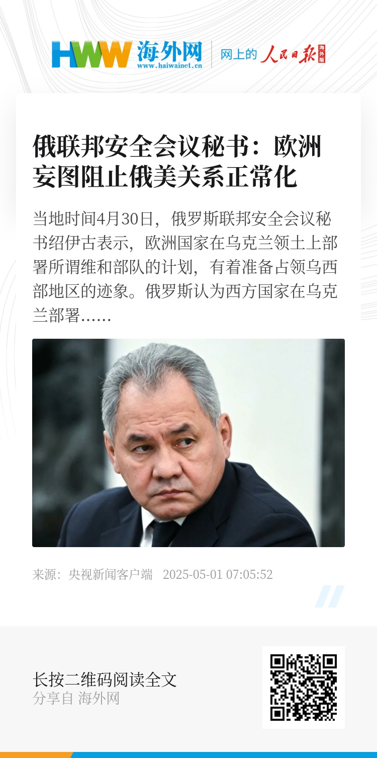 当地时间4月30日,俄罗斯联邦安全会议秘书绍伊古表示,欧洲国家在乌克兰领土上部署所谓维和部队的计划,有着准备占领乌西部地区的迹象。俄罗斯认为西方国家在乌克兰部署部队是不可接受的,他们将成为俄军合法的打击目标。绍伊古说,欧洲妄图卷入冲突,阻止俄罗斯与美国实现关系正常化。(总台记者 张誉耀)