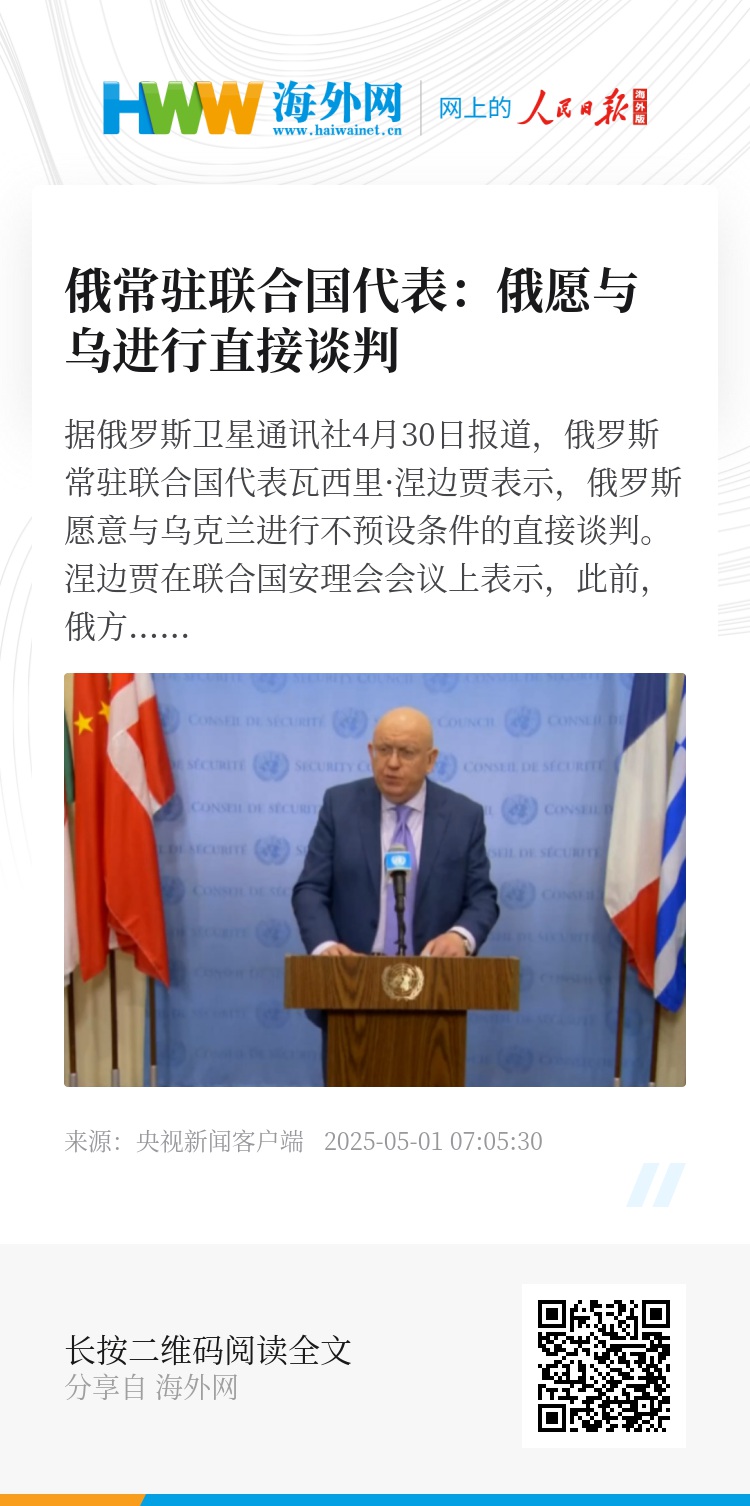 据俄罗斯卫星通讯社4月30日报道,俄罗斯常驻联合国代表瓦西里·涅边贾表示,俄罗斯愿意与乌克兰进行不预设条件的直接谈判。