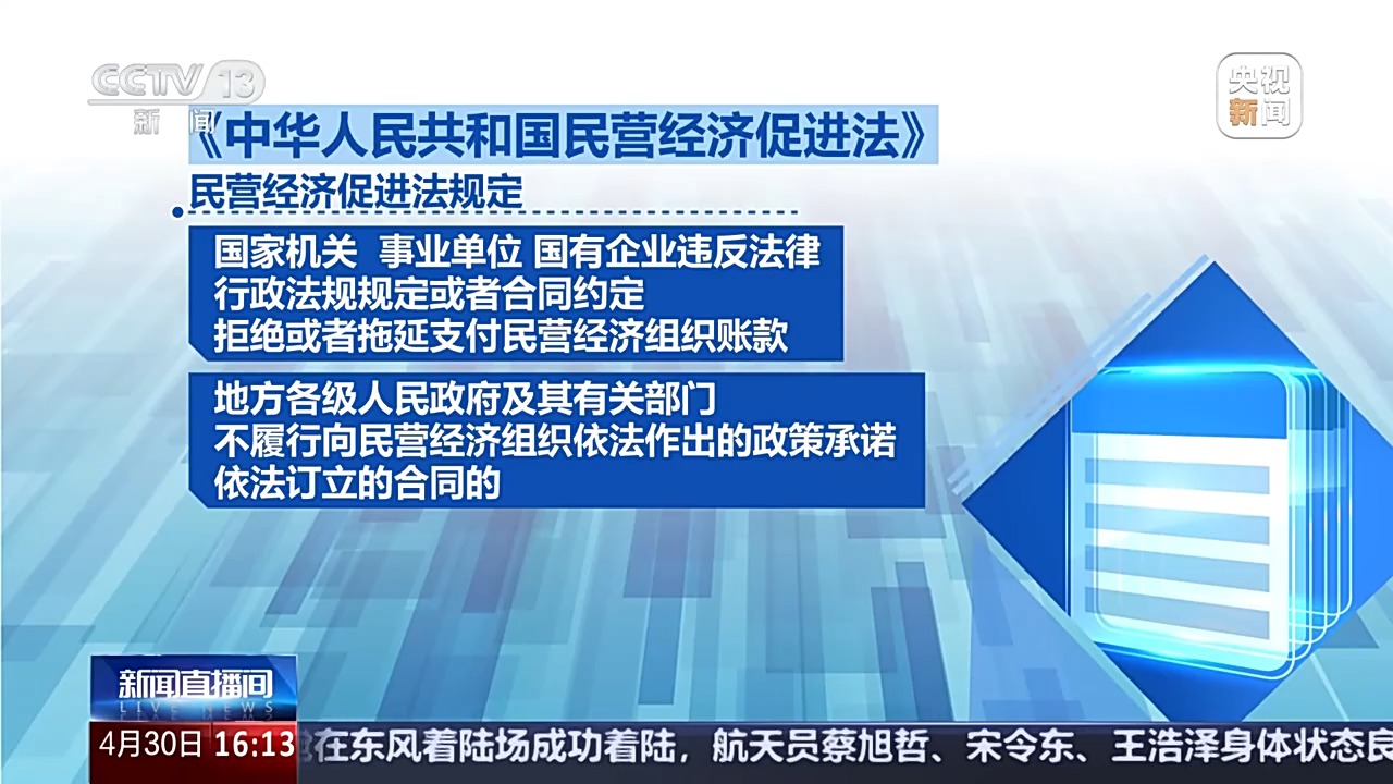 全国人大常委会法工委经济法室主任 杨合庆:针对民营经济发展中面临的公平竞争、投资融资、科技创新、服务保障、权益保护以及民营经济自身发展存在的问题和薄弱环节,充分吸收改革成果和实践经验,有针对性地细化、完善相关制度措施,并与有关法律规定作好衔接。