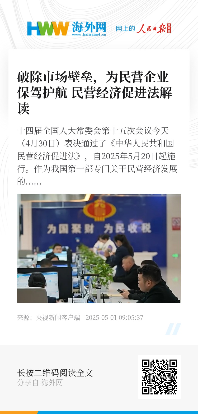 十四届全国人大常委会第十五次会议今天(4月30日)表决通过了《中华人民共和国民营经济促进法》,自2025年5月20日起施行。作为我国第一部专门关于民营经济发展的基础性法律,不仅首次将"两个毫不动摇"写入其中,更以立法形式确立了民营经济的法律主体地位。这部专项立法将如何破除市场壁垒?怎样为民营企业保驾护航?全国人大常委会法工委经济法室主任杨合庆接受了我们的专访,就该法的相关问题进行了解读。