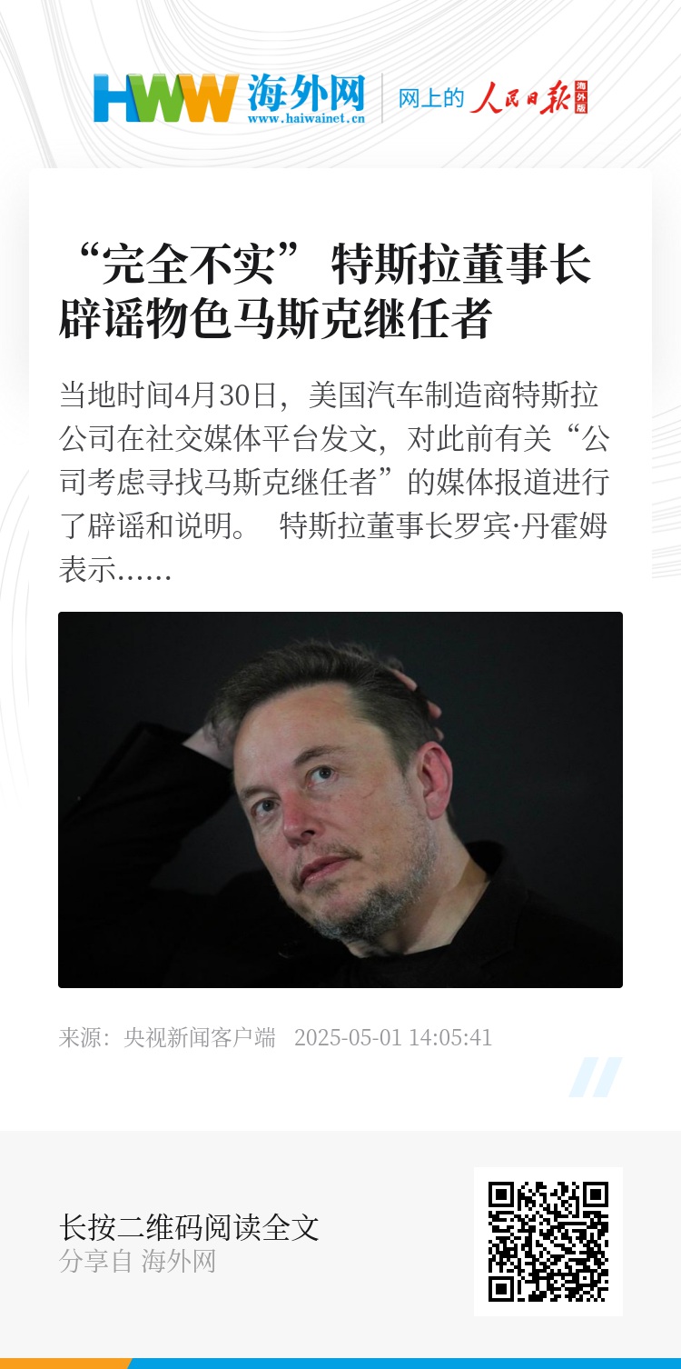 当地时间4月30日,美国汽车制造商特斯拉公司在社交媒体平台发文,对此前有关“公司考虑寻找马斯克继任者”的媒体报道进行了辟谣和说明。