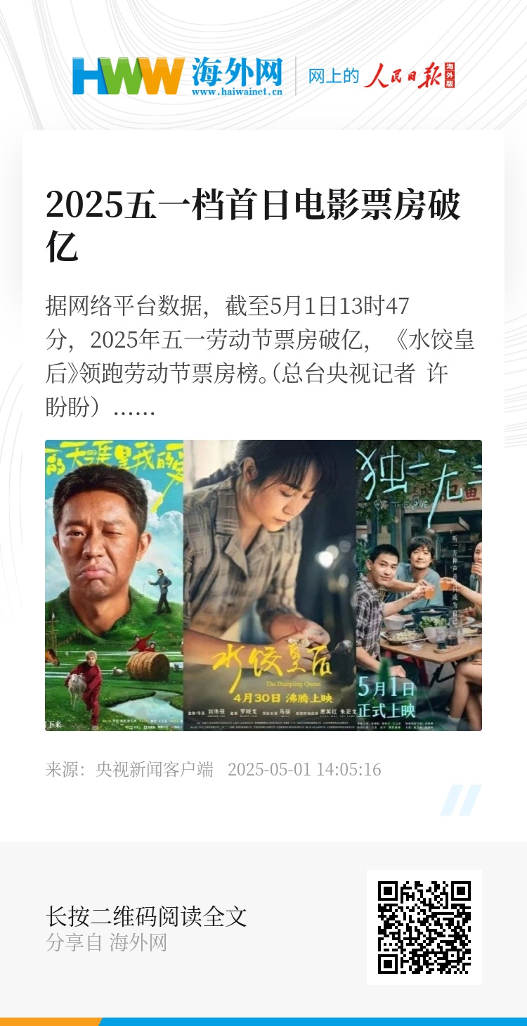 据网络平台数据,截至5月1日13时47分,2025年五一劳动节票房破亿,《水饺皇后》领跑劳动节票房榜。