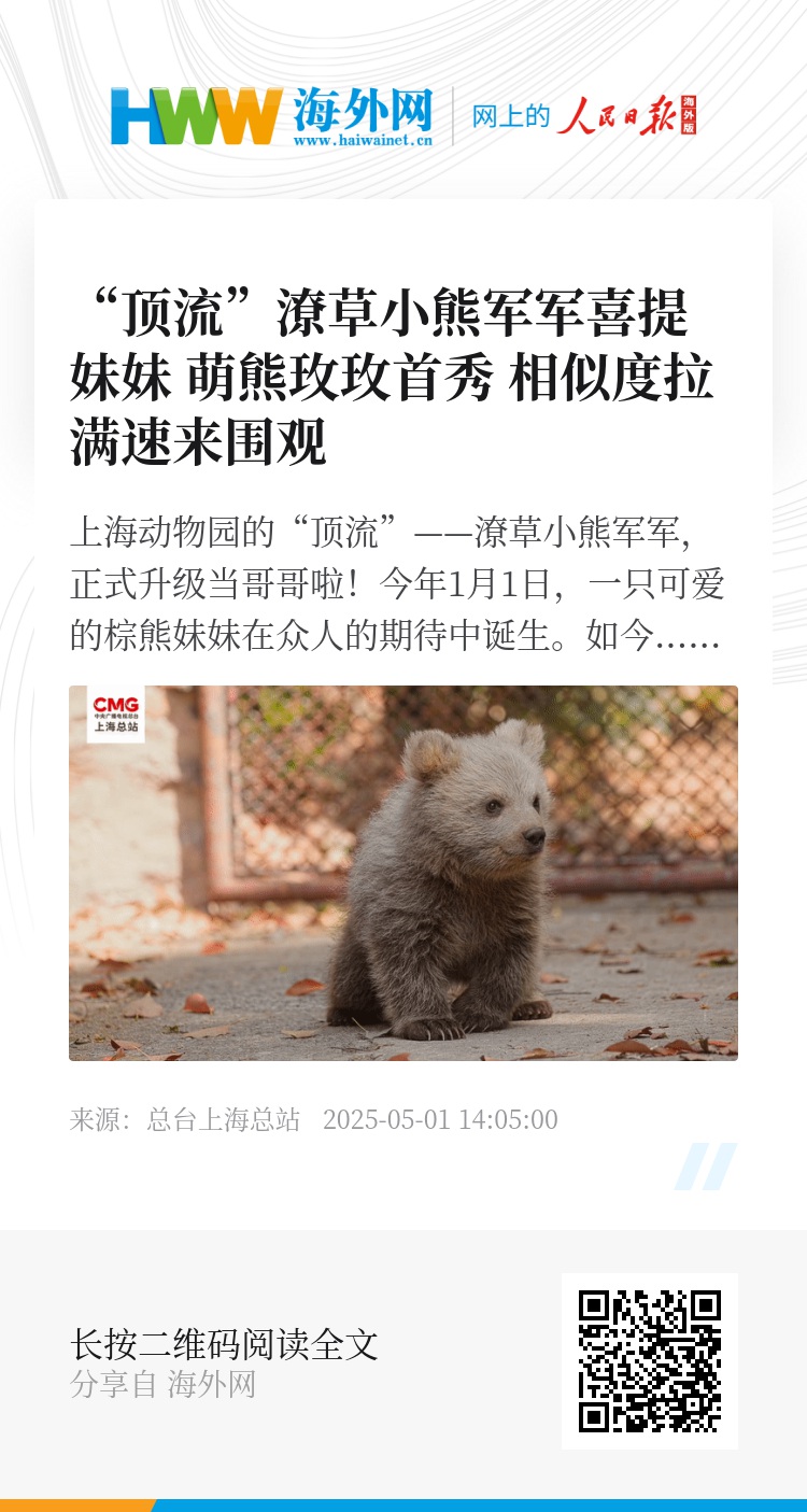 上海动物园的“顶流”——潦草小熊军军,正式升级当哥哥啦!今年1月1日,一只可爱的棕熊妹妹在众人的期待中诞生。如今,已满4个月大的它正跟着妈妈探索、适应室外展区,开启奇妙的“熊生”之旅。它一出场便受到大家的喜爱,在众多网友的热情参与下,这只“萌妹子”终于拥有了可爱的名字——玫玫。好奇玫玫和军军长得像不像?快来一探究竟吧!(总监制:陈永庆 监制:胡姗姗 记者:李京桐 顾琦佳 合作:上海动物园)