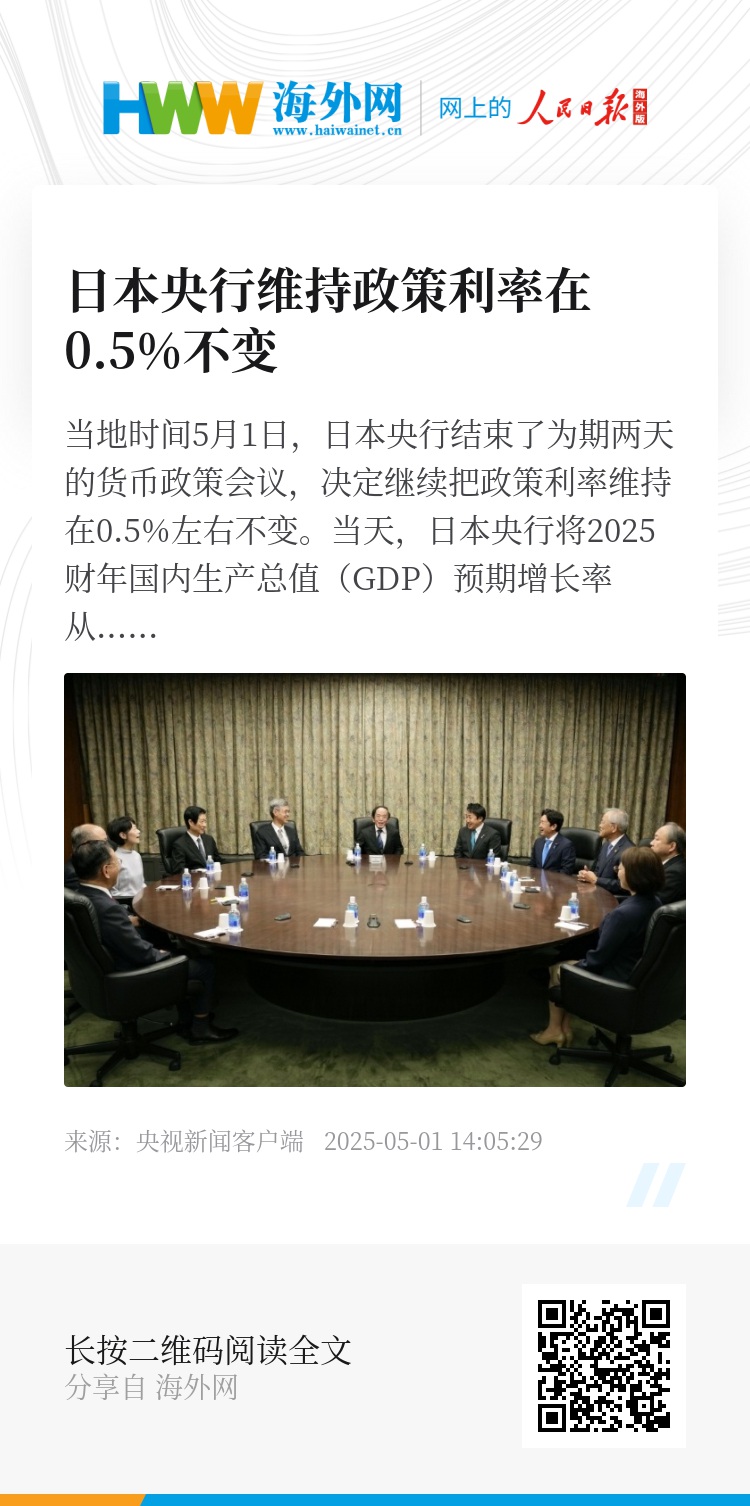 当地时间5月1日,日本央行结束了为期两天的货币政策会议,决定继续把政策利率维持在0.5%左右不变。
