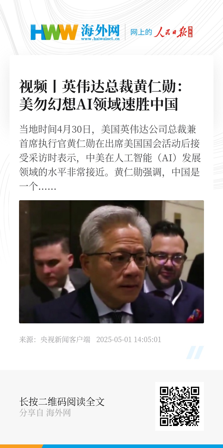 当地时间4月30日,美国英伟达公司总裁兼首席执行官黄仁勋在出席美国国会活动后接受采访时表示,中美在人工智能(AI)发展领域的水平非常接近。