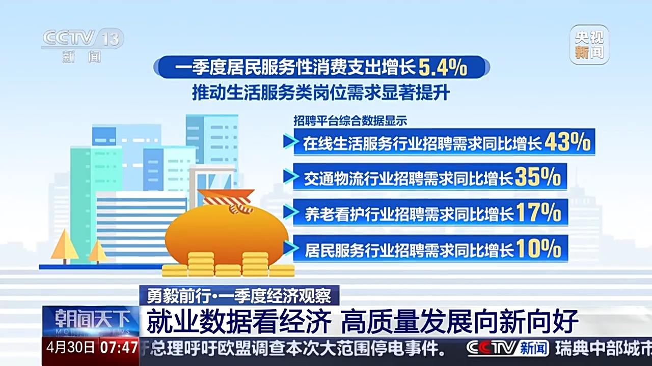 一季度居民服务性消费支出增长5.4%,推动生活服务类岗位需求显著提升。招聘平台综合数据显示,在线生活服务、交通物流、养老看护和居民服务等行业招聘需求同比分别增长43%、35%、17%和10%。