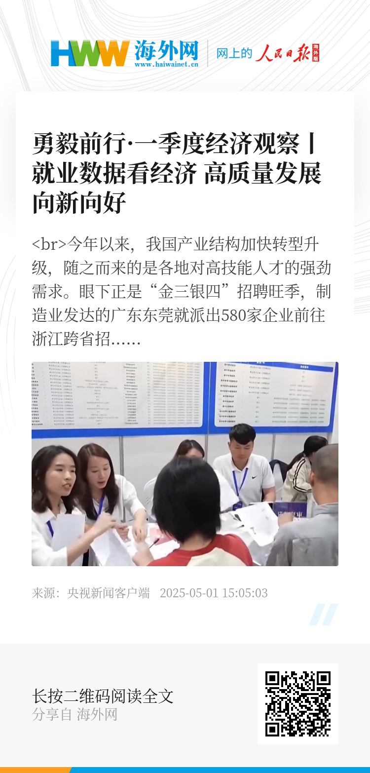 今年一季度,全国城镇新增就业308万人,同比多增5万人。一系列细分数据,折射出中国经济向新向好的发展态势。