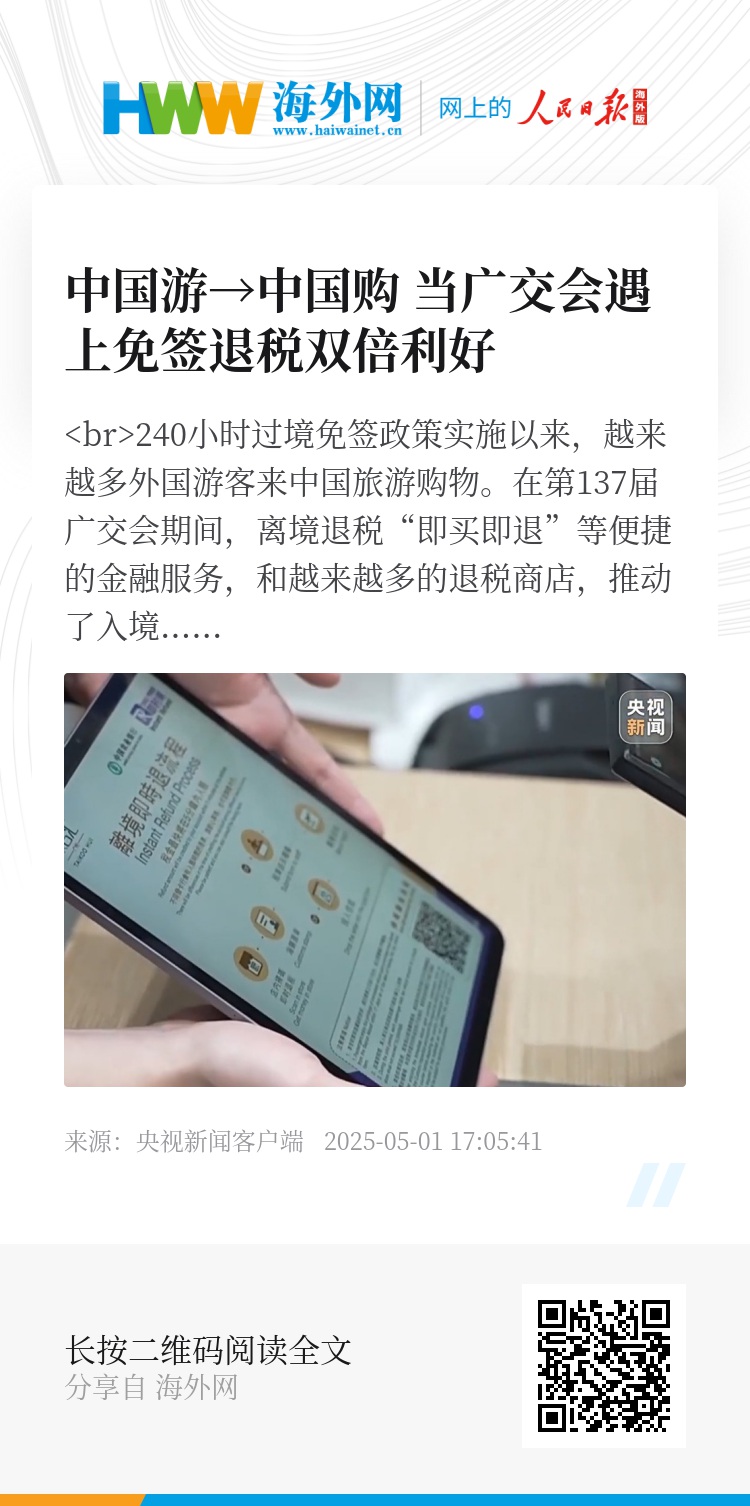 240小时过境免签政策实施以来,越来越多外国游客来中国旅游购物。在第137届广交会期间,离境退税“即买即退”等便捷的金融服务,和越来越多的退税商店,推动了入境客流转化为消费,不少境外客商爱上“中国购”。