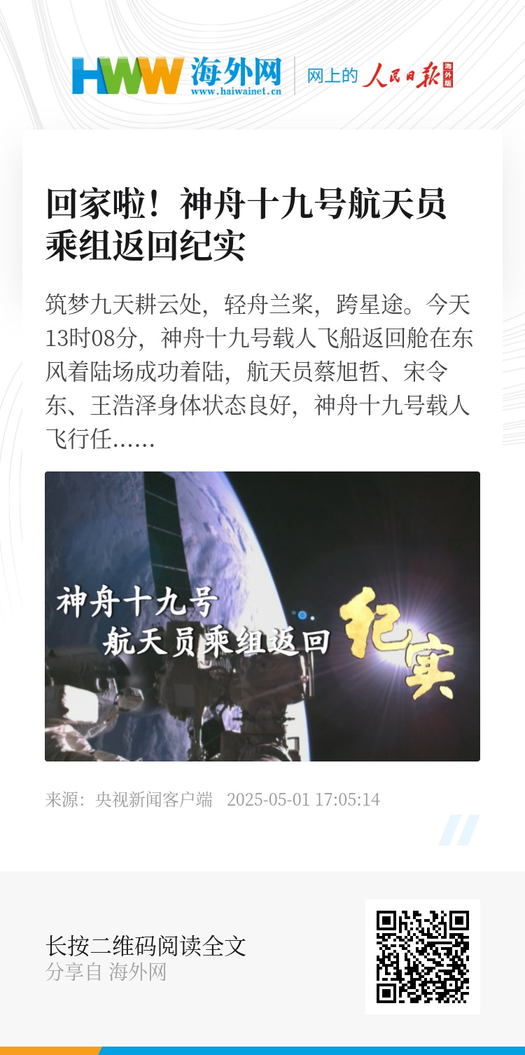 今天13时08分,神舟十九号载人飞船返回舱在东风着陆场成功着陆,航天员蔡旭哲、宋令东、王浩泽身体状态良好,神舟十九号载人飞行任务取得圆满成功。
