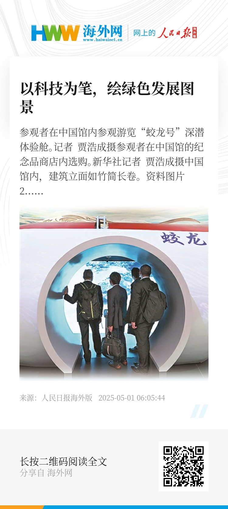 参观者在中国馆内参观游览“蛟龙号”深潜体验舱。