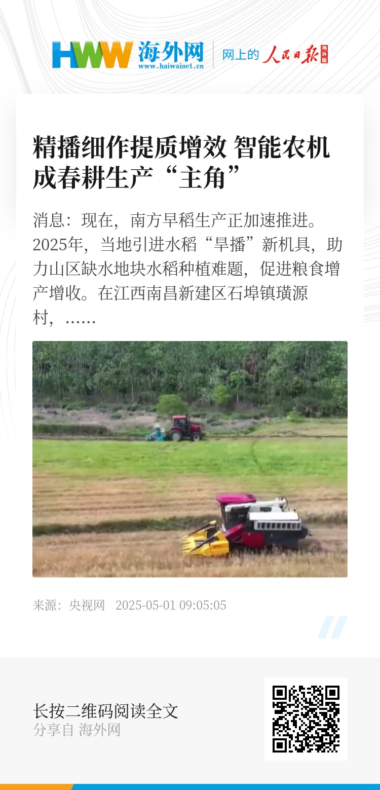 央视网消息:现在,南方早稻生产正加速推进。2025年,当地引进水稻“旱播”新机具,助力山区缺水地块水稻种植难题,促进粮食增产增收。