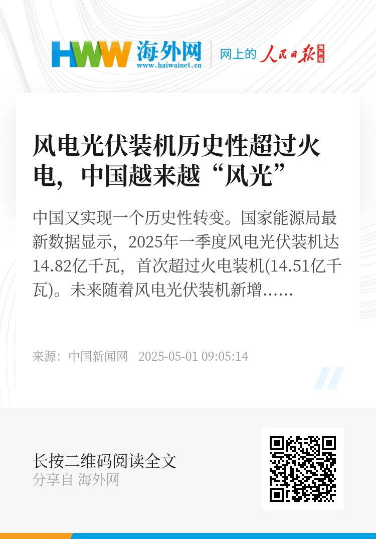 国家能源局最新数据显示,2025年一季度风电光伏装机达14.82亿千瓦,首次超过火电装机(14.51亿千瓦)。
