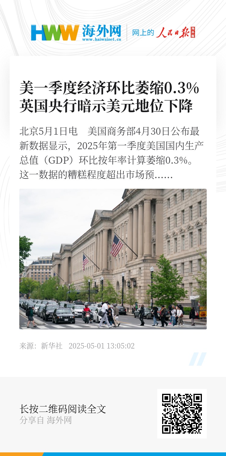 新华社北京5月1日电 美国商务部4月30日公布最新数据显示,2025年第一季度美国国内生产总值(GDP)环比按年率计算萎缩0.3%。这一数据的糟糕程度超出市场预期,凸显美国政府关税政策引发的不确定性持续上升,并导致企业与消费者信心下滑。英国媒体报道,英国中央银行英格兰银行正在评估美元近期走软可能引发的影响,暗示美元已失去避险货币地位。