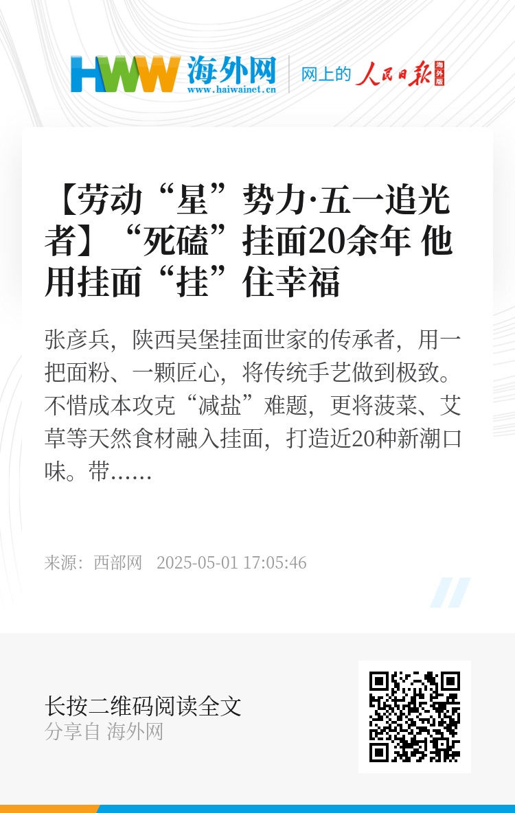 张彦兵,陕西吴堡挂面世家的传承者,用一把面粉、一颗匠心,将传统手艺做到极致。不惜成本攻克“减盐”难题,更将菠菜、艾草等天然食材融入挂面,打造近20种新潮口味。带领127名村民增收400多万元,培养千余名学生,推动吴堡挂面年产值破亿。从传统技艺到产业振兴,张彦兵凭借一身本领和一手教学,先后获得了“吴堡县首届优秀科技工作者”“陕西省劳动模范”等称号,更在4月28日获得“全国劳动模范”荣誉称号。岁月流转,他还将继续和挂面“相爱相杀”下去。
