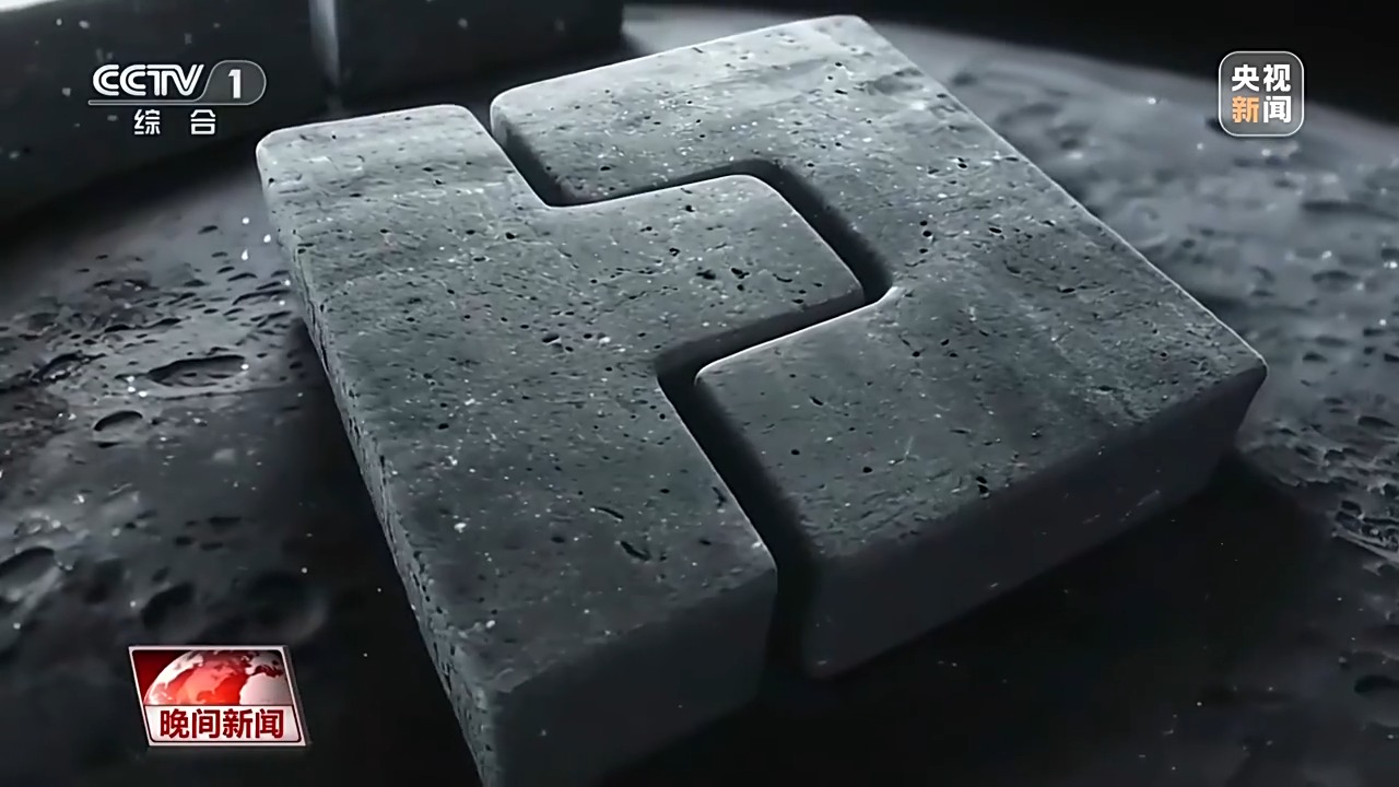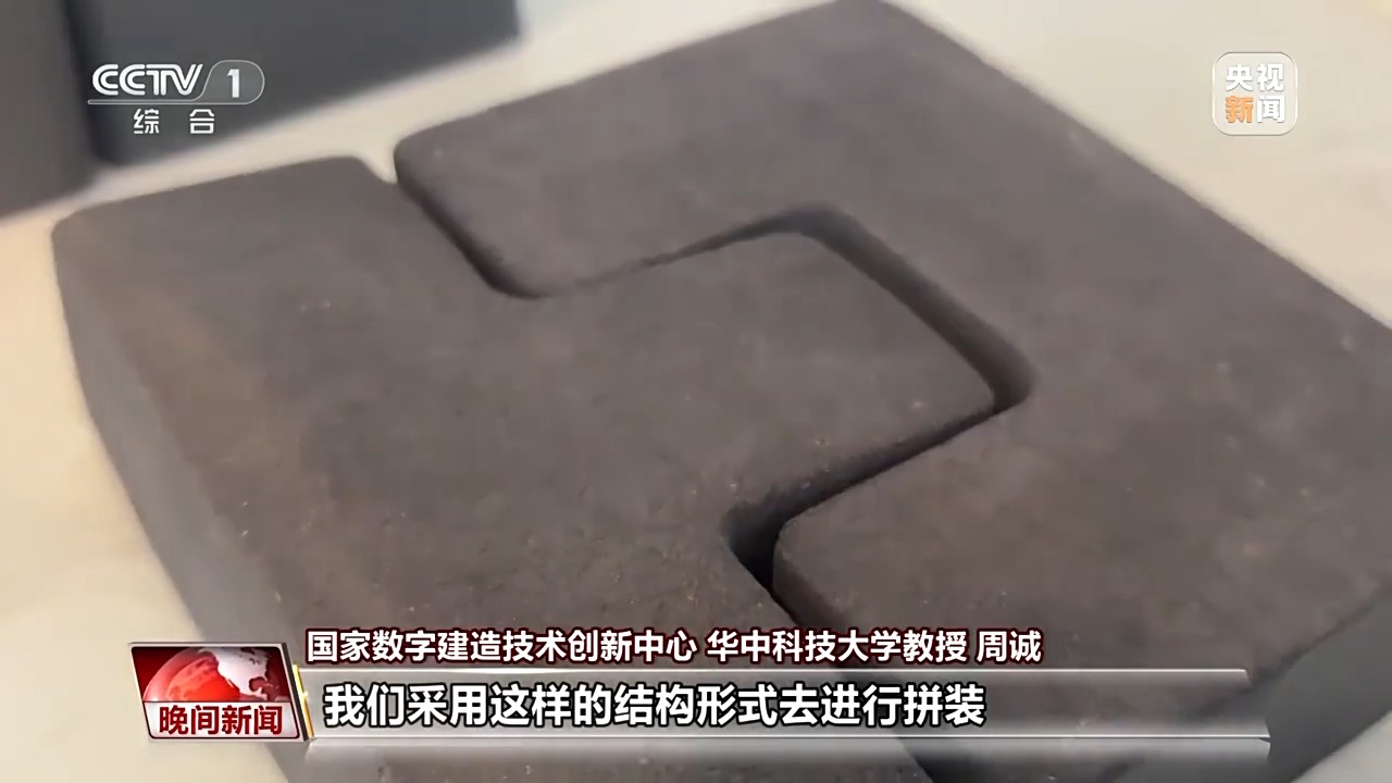 国家数字建造技术创新中心 华中科技大学教授 周诚:我们看到的这两块砖呈现的是榫卯结构,有利于在未来的月球基地的建造过程中,我们采用这样的结构形式进行拼装。
