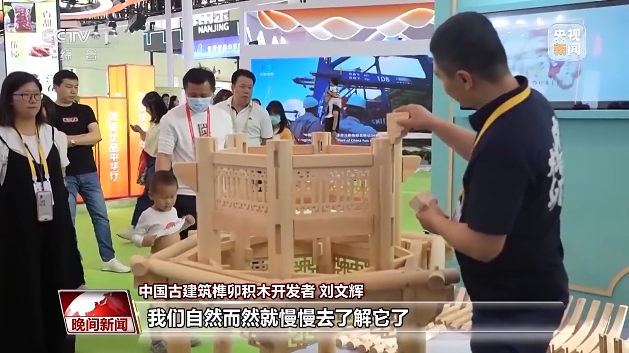 与“斗拱爷爷”一样,来自浙江杭州的刘文辉也在用自己的方式,拉近人们与传统文化之间的距离。十几年前,他开始钻研中国古建筑营造技艺,如何能让非遗技艺变得简单又快乐?刘文辉想到了把榫卯结构做成积木。在不久前的第五届中国国际消费品博览会上,刘文辉将自己研发的榫卯积木带上了展会。
