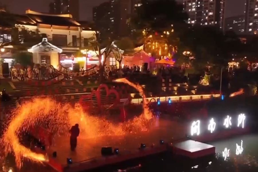 从4月30日开始,一直到5月3日,这里每晚都会举行舞火龙和炭花舞的演出。可以看到,舞火龙的龙脊迸射出的火花就像星河倾泻一样;而在非遗炭花舞的表演中,舞者奋力甩动装有炭火的网笼,漫天炭火在空中划出轨迹,与粼粼水光交相辉映,呈现出“火树银花”的绚烂景象。