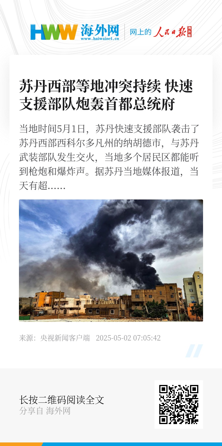 此外,有军方消息透露,快速支援部队1日使用远程火炮,再次炮轰了位于苏丹首都喀土穆市中心的总统府,这已是其本周内第二次对首都发起炮轰。快速支援部队发起炮轰的地点,是其控制的临近喀土穆市的恩图曼市萨勒哈地区据点。目前暂无人员伤亡的报告。