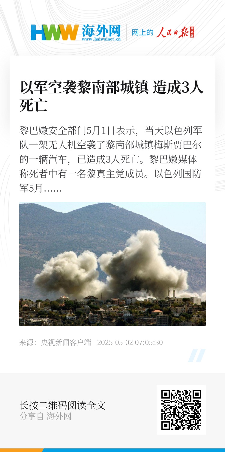 黎巴嫩安全部门5月1日表示,当天以色列军队一架无人机空袭了黎南部城镇梅斯贾巴尔的一辆汽车,已造成3人死亡。黎巴嫩媒体称死者中有一名黎真主党成员。