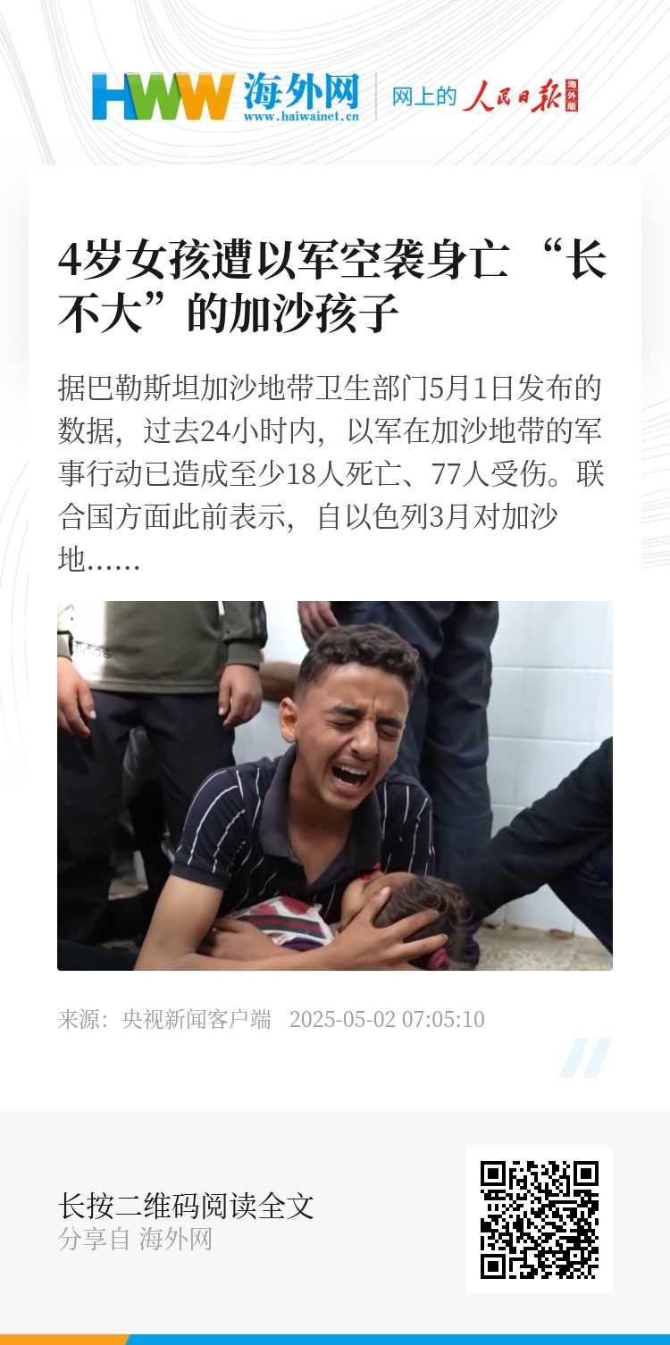 联合国方面此前表示,自以色列3月对加沙地带恢复军事打击以来,以军持续空袭造成大量平民伤亡,而其中相当一部分是妇女和儿童。4岁的加沙女孩玛萨,近日永远离开了深爱她的家人。