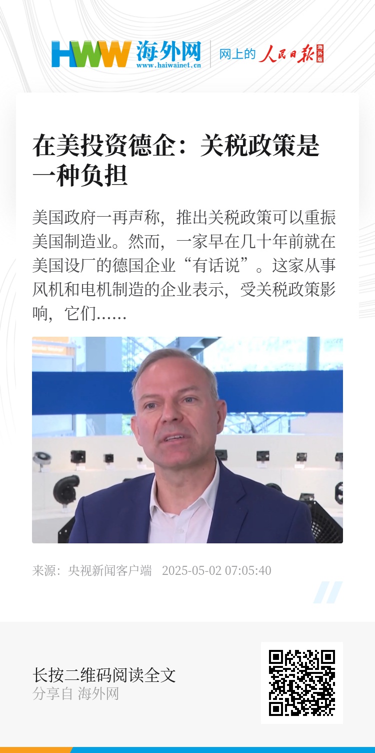 美国政府一再声称,推出关税政策可以重振美国制造业。然而,一家早在几十年前就在美国设厂的德国企业“有话说”。这家从事风机和电机制造的企业表示,受关税政策影响,它们的产品被迫涨价,在美国扩建工厂的计划也被迫搁置。