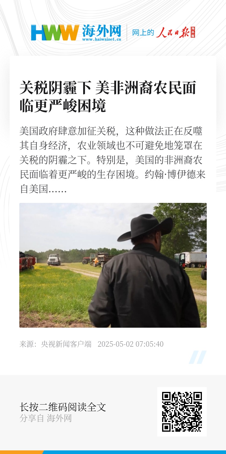 美国政府肆意加征关税,这种做法正在反噬其自身经济,农业领域也不可避免地笼罩在关税的阴霾之下。特别是,美国的非洲裔农民面临着更严峻的生存困境。