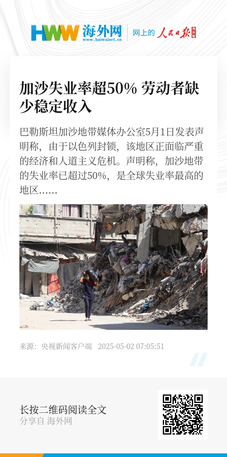 巴勒斯坦加沙地带媒体办公室5月1日发表声明称,由于以色列封锁,该地区正面临严重的经济和人道主义危机。声明称,加沙地带的失业率已超过50%,是全球失业率最高的地区之一。以色列军队摧毁了加沙地带的工业设施和公共服务设施,当地劳动者无法获得稳定的收入来源。(总台记者 魏然)