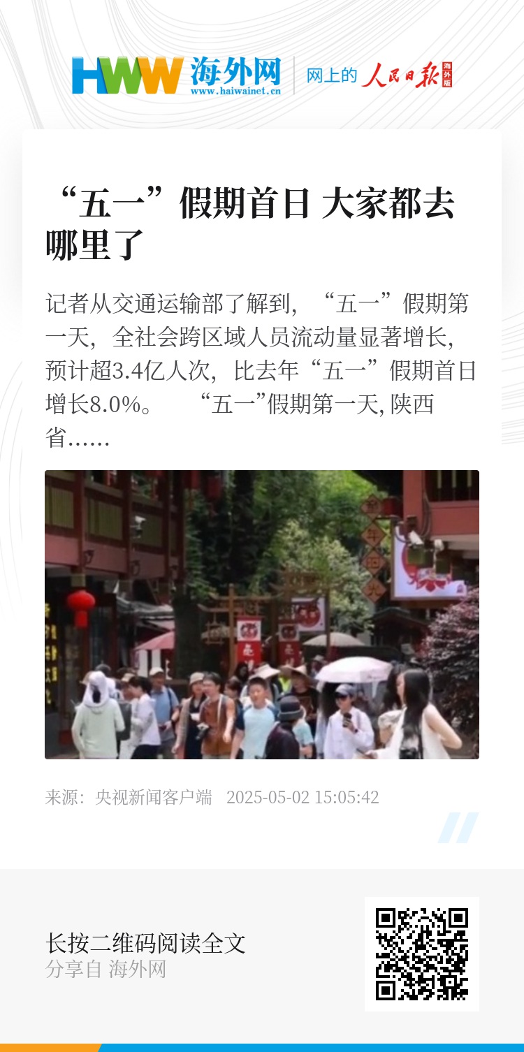 记者从交通运输部了解到,“五一”假期第一天,全社会跨区域人员流动量显著增长,预计超3.4亿人次,比去年“五一”假期首日增长8.0%。