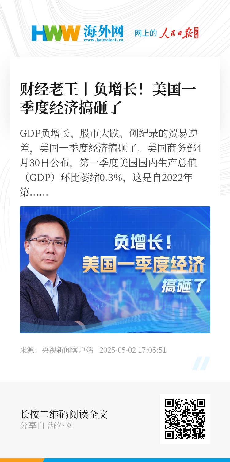 美国商务部4月30日公布,第一季度美国国内生产总值(GDP)环比萎缩0.3%,这是自2022年第一季度以来首次出现负增长,并且显著低于去年第三季度3.1%和第四季度2.4%的增速。美国财政部前官员更是一针见血指出,美国经济今年下半年可能陷入衰退。