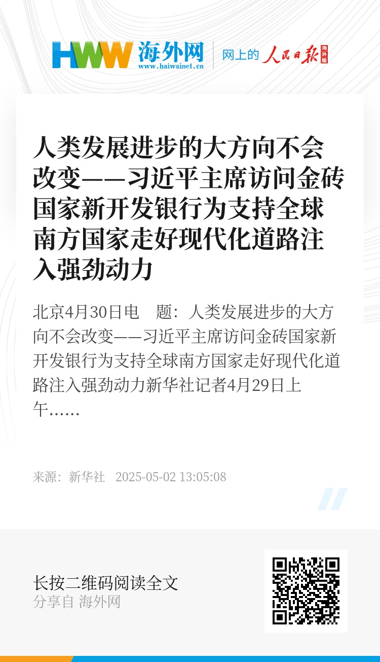 新华社北京4月30日电 题:人类发展进步的大方向不会改变——习近平主席访问金砖国家新开发银行为支持全球南方国家走好现代化道路注入强劲动力
