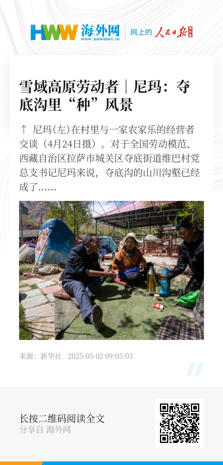 对于全国劳动模范、西藏自治区拉萨市城关区夺底街道维巴村党总支书记尼玛来说,夺底沟的山川沟壑已经成了他的另一个“家”。到维巴村任职以来,雨季他率队轮巡、盯水情,旱季他带领大家清淤泥、修水渠。为了改善村子的环境,他和村民一起植木成荫、退牧还林,曾受黄沙侵扰的村子如今变了模样。