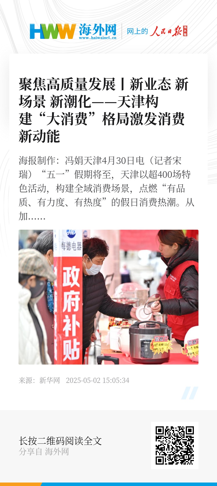 新华网天津4月30日电(记者宋瑞)“五一”假期将至,天津以超400场特色活动,构建全域消费场景,点燃“有品质、有力度、有热度”的假日消费热潮。