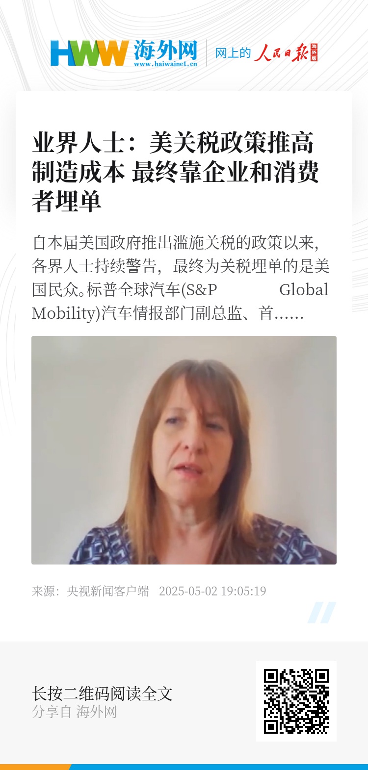 标普全球汽车 汽车情报部门副总监 斯蒂芬妮·布林利:这种成本上涨是人为的,因为它不是跟需求挂钩,也不是跟原材料成本挂钩,不是跟运输挂钩,也不是跟供需关系挂钩,它完全是人为加上去的。但关税最终通常是由消费者承担的,关税是在公司进口时支付的,不是国家支付的,也不是政客支付的,最终,是消费者在承担这部分成本。