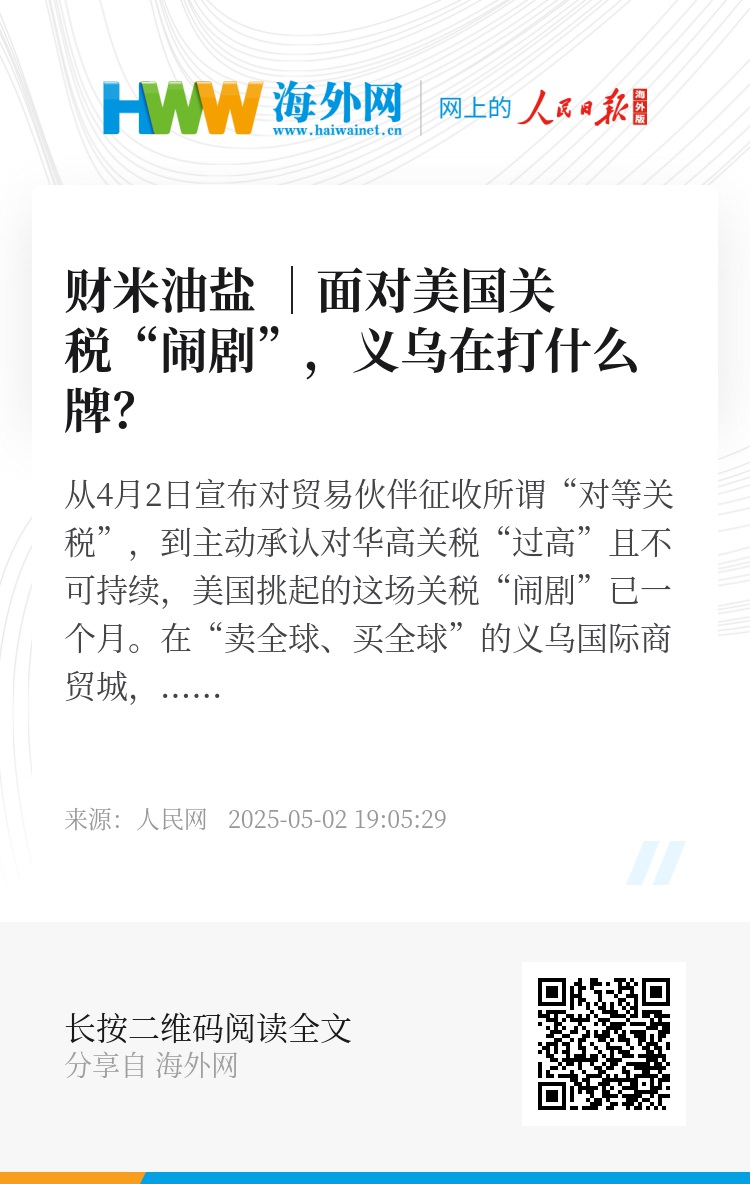 广阔的市场空间、成熟的产业链条、及时的政策支持,给予了义乌老板们敢闯敢创的底气,让义乌这座外贸重镇在国际风云变幻中更显韧性。在一次次面对面的交谈中、实打实的合同里,这座“世界超市”始终“敞开大门做生意”,将全球230多个国家和地区与210多万家“中国制造”企业紧密相连。