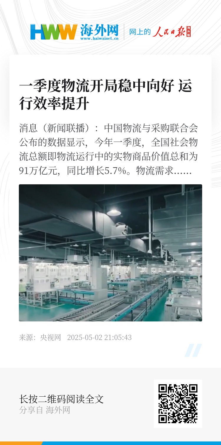 央视网消息(新闻联播):中国物流与采购联合会公布的数据显示,今年一季度,全国社会物流总额即物流运行中的实物商品价值总和为91万亿元,同比增长5.7%。物流需求结构持续优化,大规模设备更新、消费品以旧换新政策推动相关物流需求持续向好。一季度,工业品物流领域的通用设备、专用设备制造相关物流需求同比分别增长9.4%、4.1%;商贸物流领域的通讯器材类、家用电器、家具类商品零售相关物流需求增长均在20%左右。